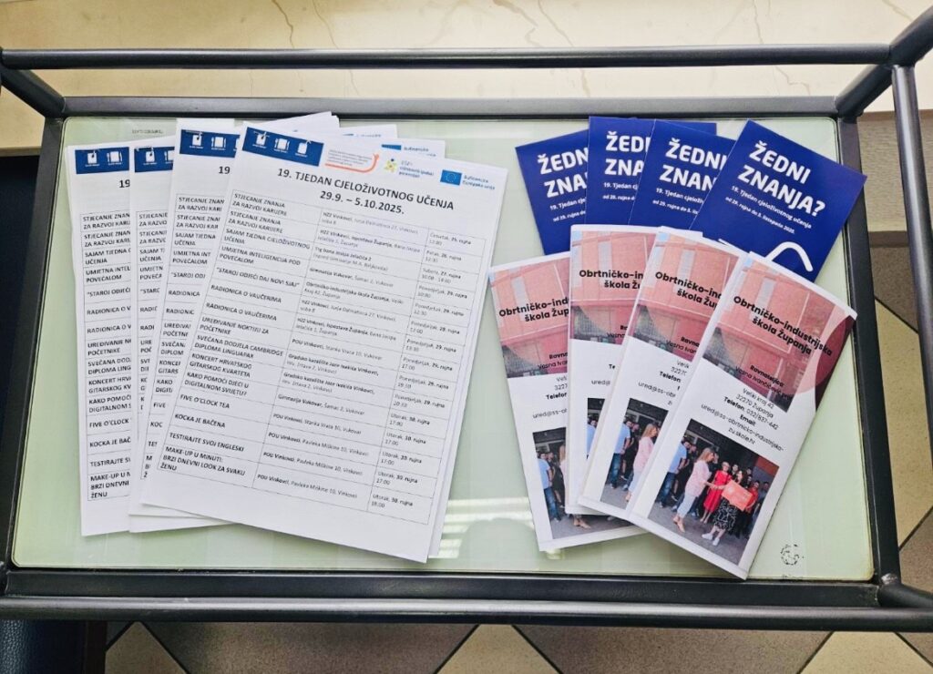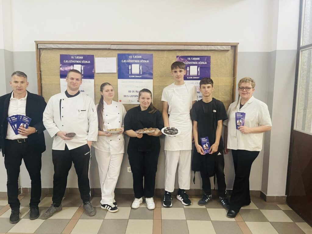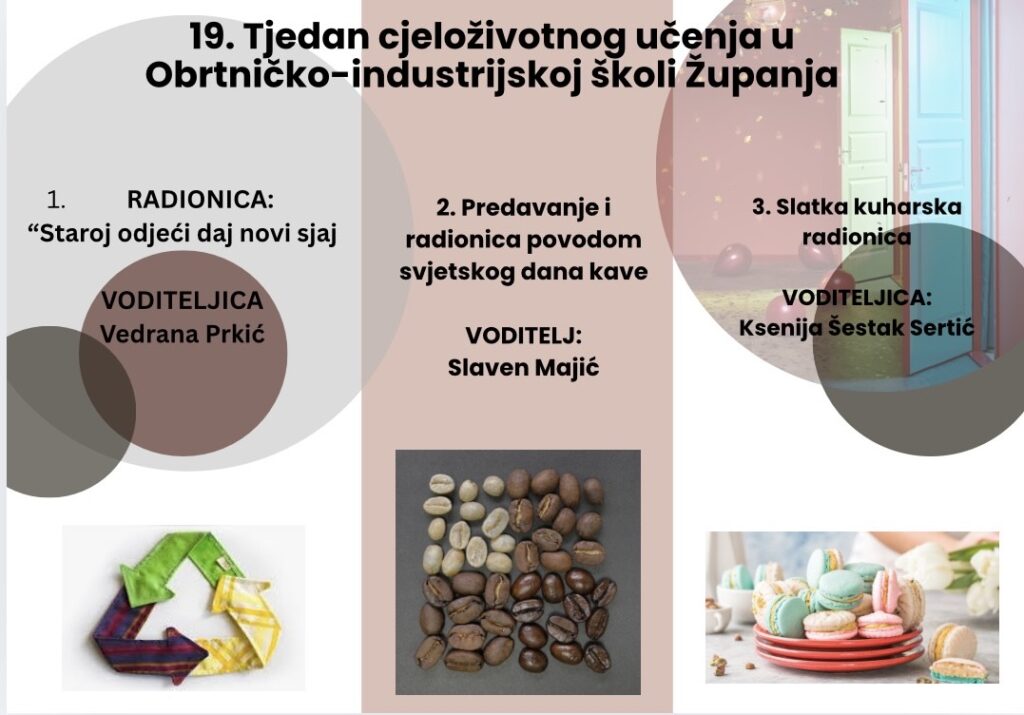 U našoj školi aktivnosti su u okviru 19. Tjedna cjeloživotnog učenja provela tri profesora strukovnih predmeta: Slaven Majić, Ksenija Šestak Sertić i Vedrana Prkić. Profesor Slaven Majić je povodom Svjetskog dana kave 1. listopada 2025. godine održao radionicu na kojoj su se učenici i djelatnici škole upoznali s okusima različitih vrsta kave. Svi prisutni su educirani s načinima pripreme napitaka od kave: espresso kava, macchiato, latte macchiato i cappuccino. Miris kave se taj dan posebno širio prostorima škole te je kabinet konobara bio mjesto susreta i druženja nastavnika i učenika degustacijom različitih vrsta kave. Dodatni doprinos je dala profesorica Ksenija Šestak Sertić koja je sudjelovala sa svojim učenicima 2.f razreda tako što su pripremili „Slatku kuharsku radionicu“ izradom nekoliko vrsta kolača od kave, a koji su se također mogli degustirati istoga dana. 29. rujna 2025. godine Vedrana Prkić je održala predavanje i radionicu na temu recikliranja i ponovne uporabe te održivog razvoja. Volonterke Školskog volonterskog kluba „Agape“ su od odjeće (tekstila) koji se više nije koristio izrađivale etuije (pernice) za kozmetiku i nakit te izrezivale, rukom šivale dio (napravile pripremu), a šivaćom mašinom ih je profesorica Sanja Stojanović završila. Na kraju su učenice dodavale detalje i zajedno a profesoricom Prkić napravile izložbu radova u školi, čime smo ujedno obilježili i deset godina Europskog tjedna održivog razvoja koji se odvijao od 18. rujna do 8. listopada 2025.godine. Profesorica Prkić je napravila i brošuru za događanja iz škole za Tjedan cjeloživotnog učenja koja je bila izložena u Vinkovcima u Pučkom otvorenom učilištu i na sajmu na Korzu. Na taj smo način sudjelovali i dali svoj doprinos kao škola ovim dvjema velikim događanjima i inicijativama u Hrvatskoj, ali i izvan Hrvatske.
