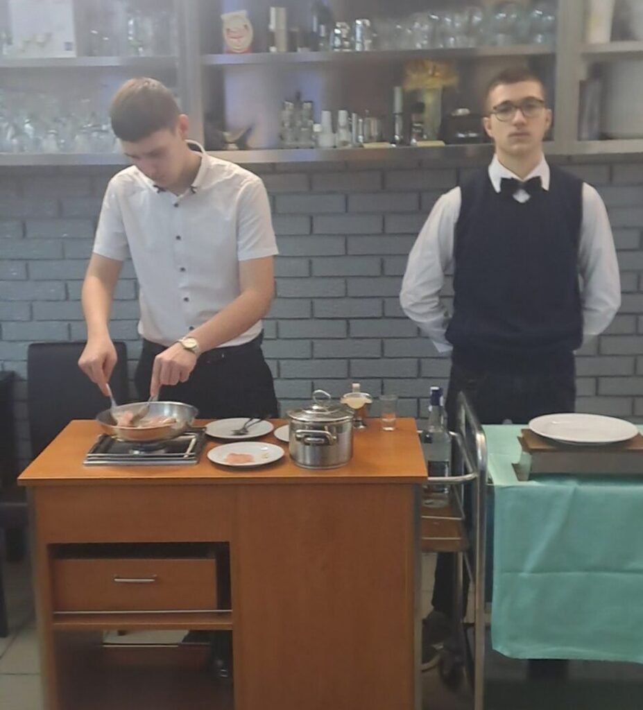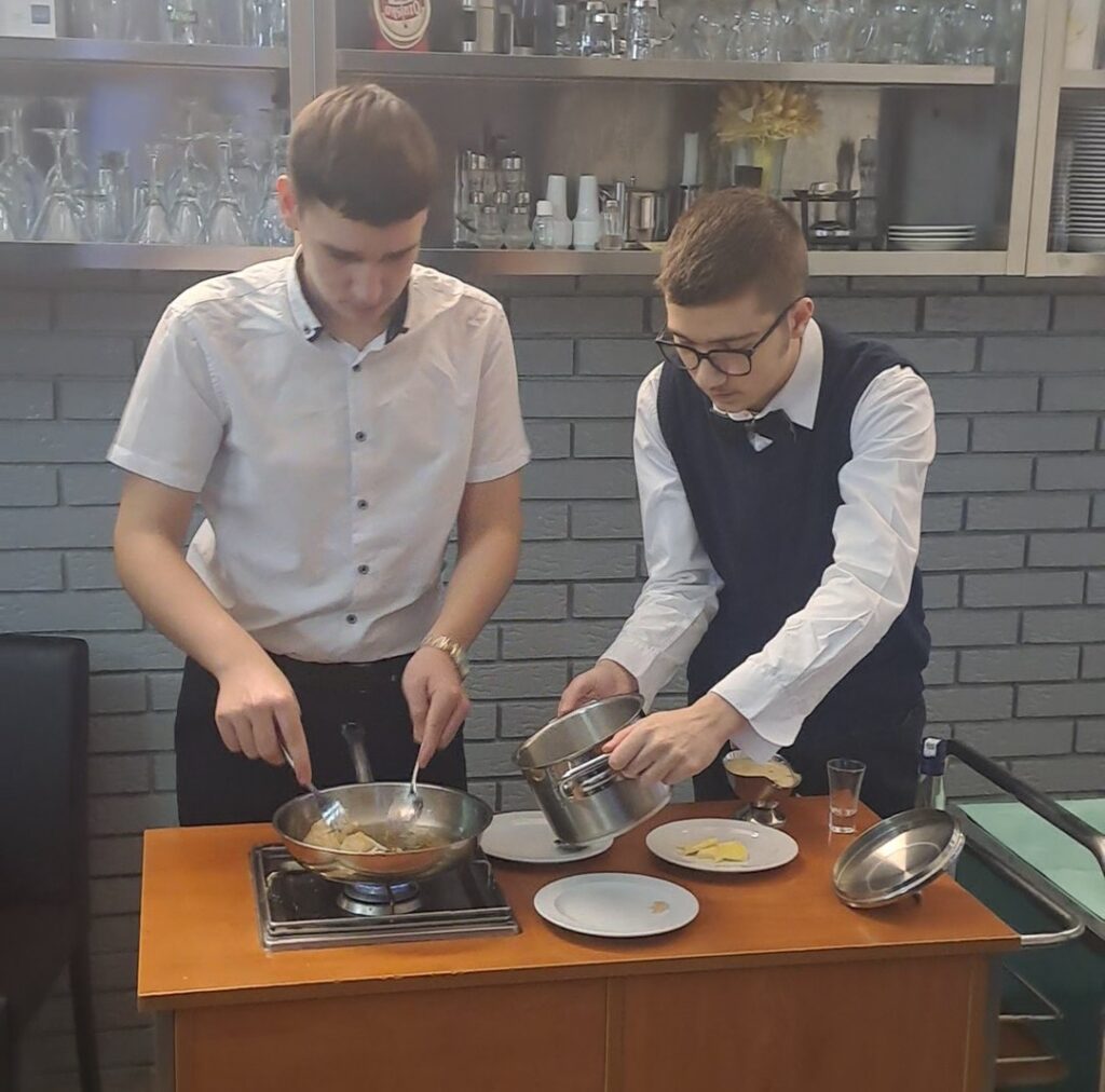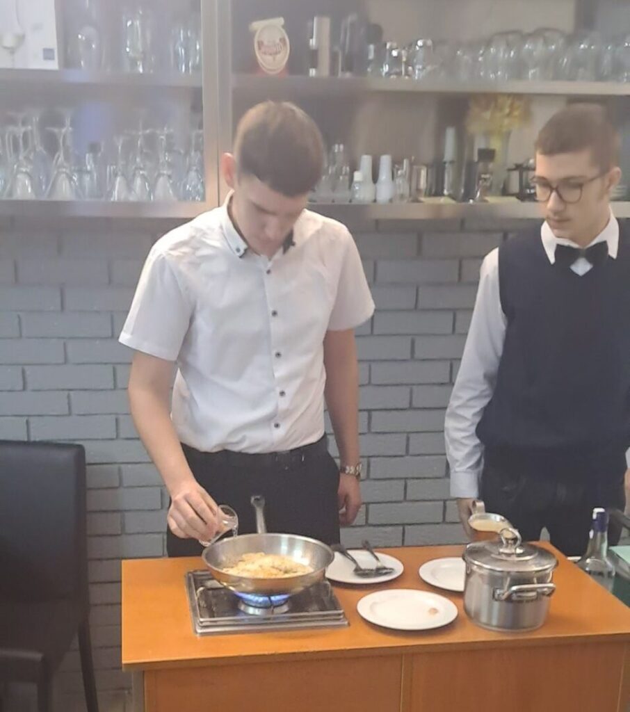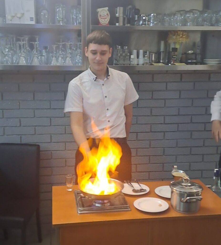 Učenici 3. f razreda, smjera konobar, pod stručnim nadzorom nastavnika Slavena, izveli su zadatak dovršavanja jela pred gostima primjenjujući tehniku flambiranja.