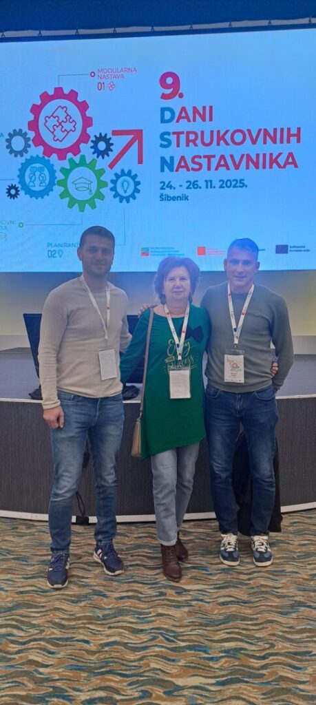 Agencija za strukovno obrazovanje i obrazovanje odraslih organizirala je najveći nacionalni skup za nastavnike strukovnih predmeta – IX. Dane strukovnih nastavnika, na kojima su sudjelovali nastavnici strukovnih predmeta naše škole, Dubravka Gvozdić, Ivan Stojanović i Slaven Majić. Skup se održavao od 24. do 26. studenoga 2025. godine u Amadria Park hotelu u Šibeniku, u okviru ESF+ projekta Daljnja provedba kurikularne reforme strukovnog obrazovanja. Događanje je okupilo oko 500 sudionika iz cijele Republike Hrvatske, a poseban naglasak je stavljen na promjene u sustavu strukovnog obrazovanja kroz modularnu nastavu i uvođenje novih kurikulskih dokumenata.