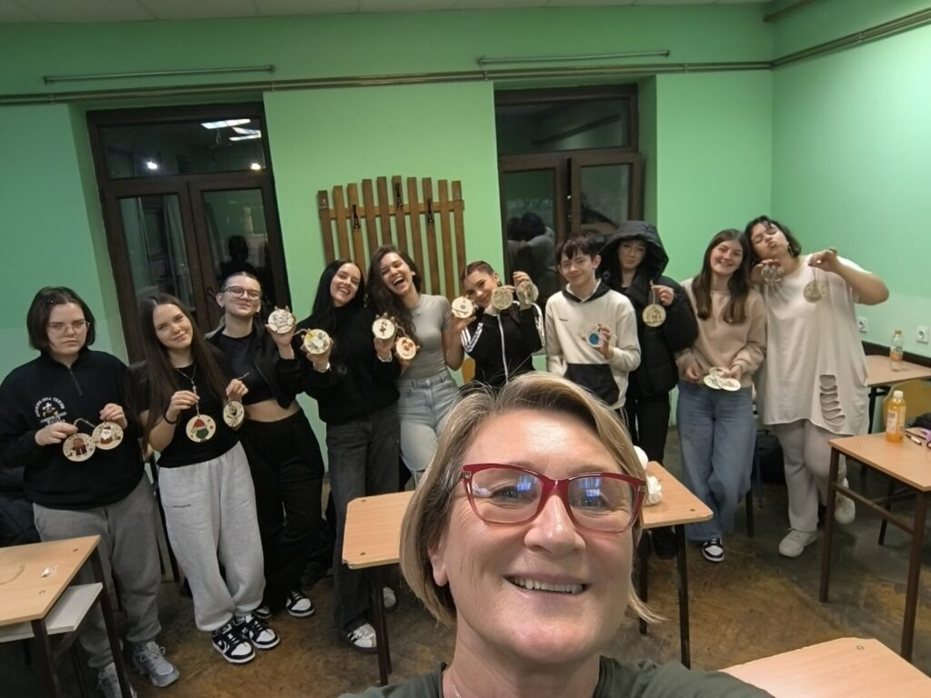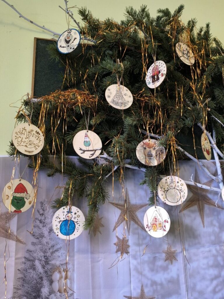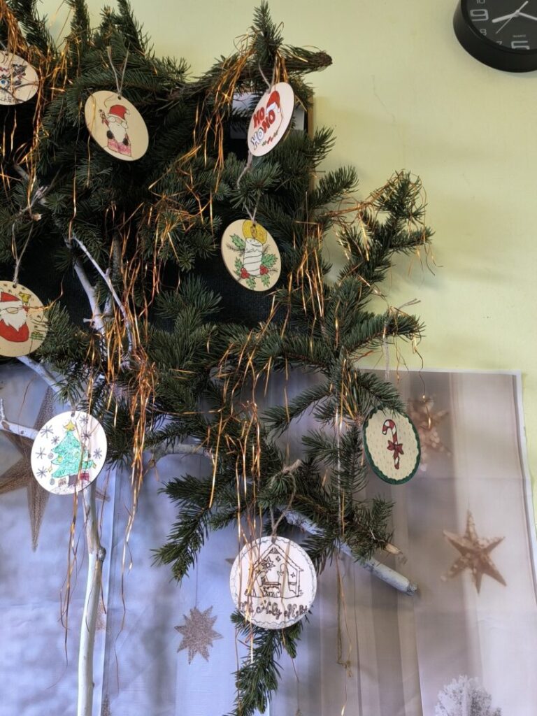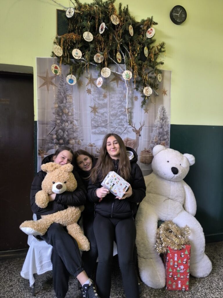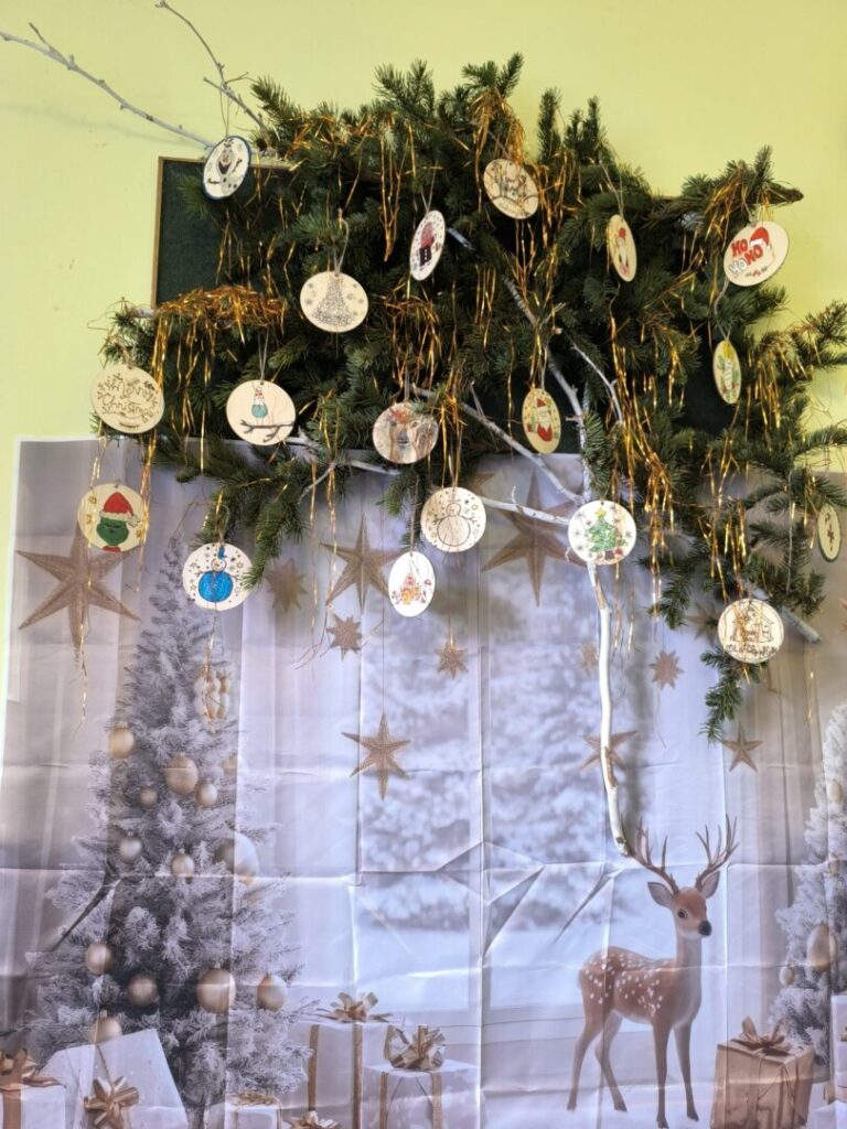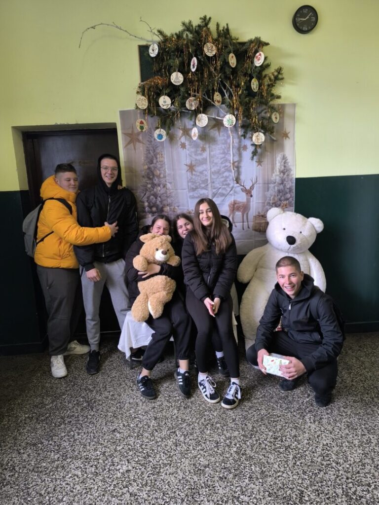 Danas nam je veselje donio mali sretni kutak i dva slatka medvjedića, pa smo odjednom svi postali dio neke druge priče — fotografirali se i smijali. Kutak su uredili članovi Učeničke zadruge „Klasje“, učenici 2.c razreda – frizeri, te 1.e razreda – pomoćni kuhari, kao i svi koji su se ondje zatekli u prolazu. Kuglice na boru su unikatne; izradili su ih učenici 2.c razreda, naši kreativni i maštoviti frizeri, s profesoricom Elvirom Lučić, voditeljicom zadruge. Kuglice su ručni rad na drvenoj podlozi, izrađene tehnikom pirografije i bojicama.