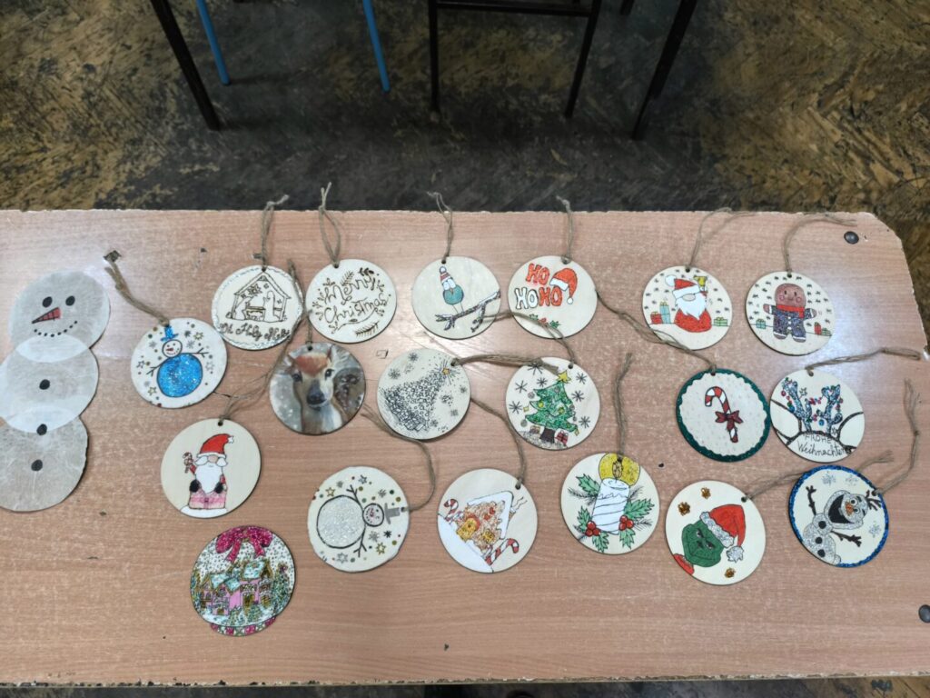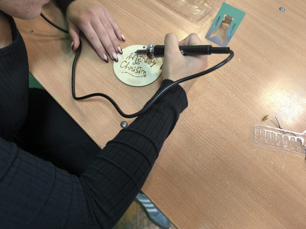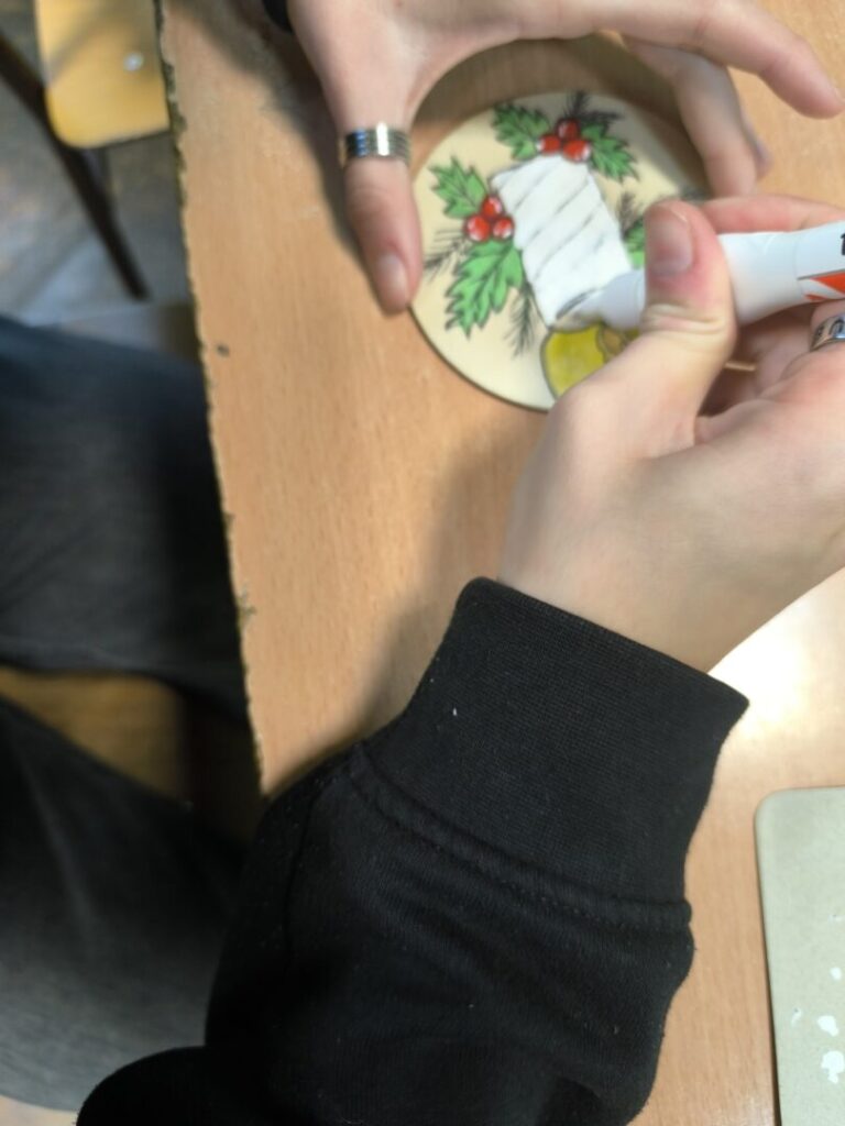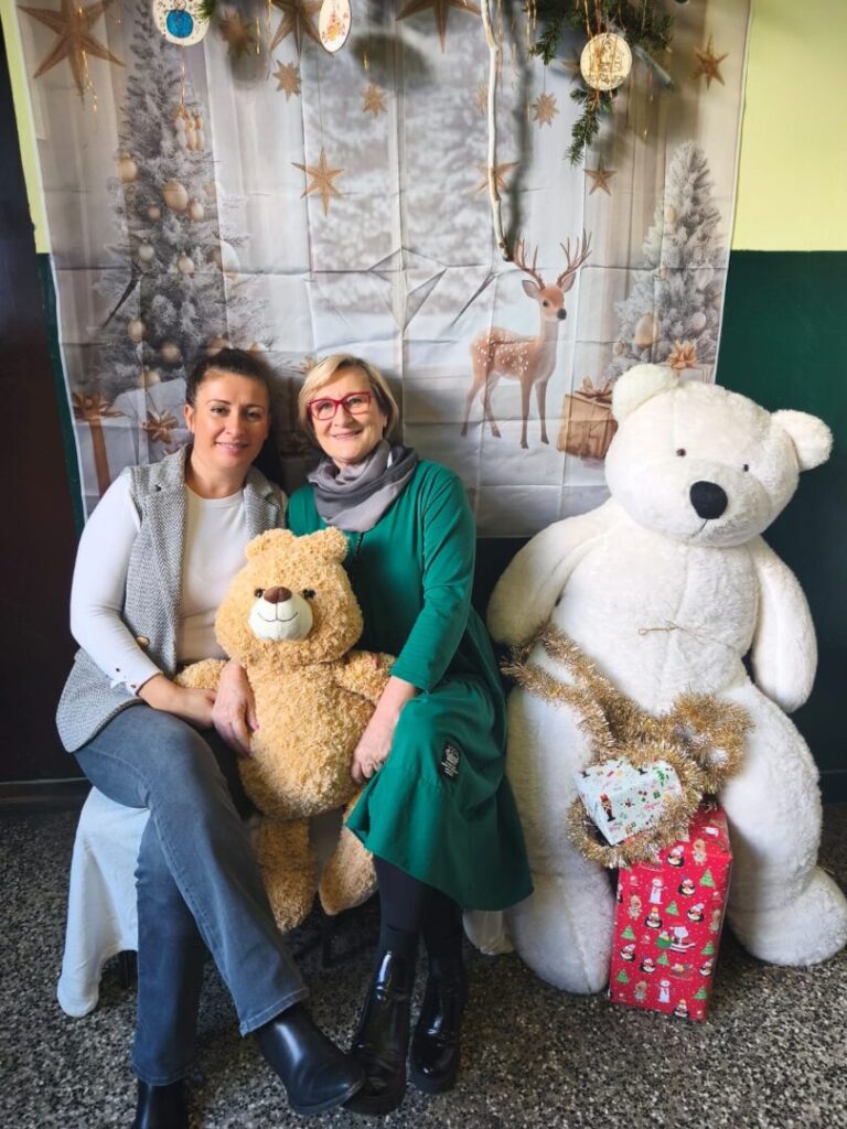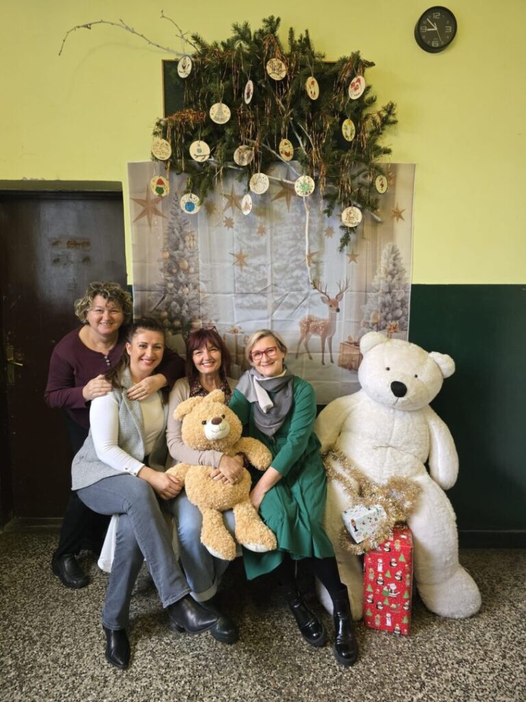 Danas nam je veselje donio mali sretni kutak i dva slatka medvjedića, pa smo odjednom svi postali dio neke druge priče — fotografirali se i smijali. Kutak su uredili članovi Učeničke zadruge „Klasje“, učenici 2.c razreda – frizeri, te 1.e razreda – pomoćni kuhari, kao i svi koji su se ondje zatekli u prolazu. Kuglice na boru su unikatne; izradili su ih učenici 2.c razreda, naši kreativni i maštoviti frizeri, s profesoricom Elvirom Lučić, voditeljicom zadruge. Kuglice su ručni rad na drvenoj podlozi, izrađene tehnikom pirografije i bojicama.