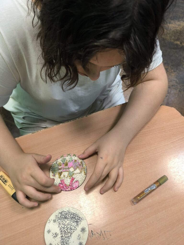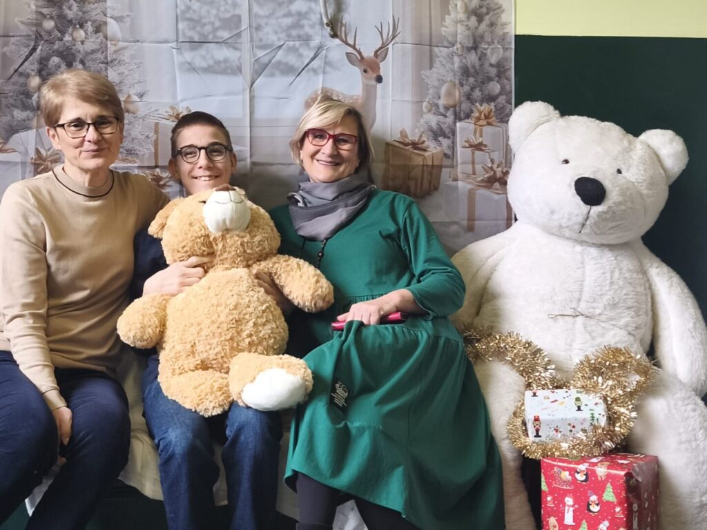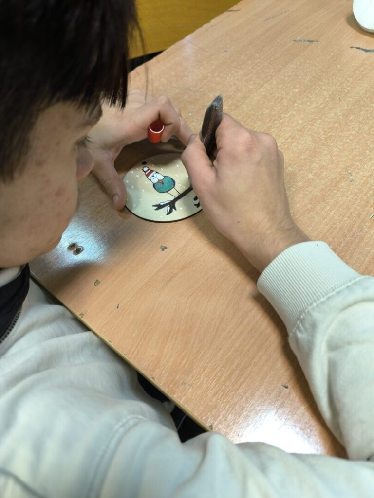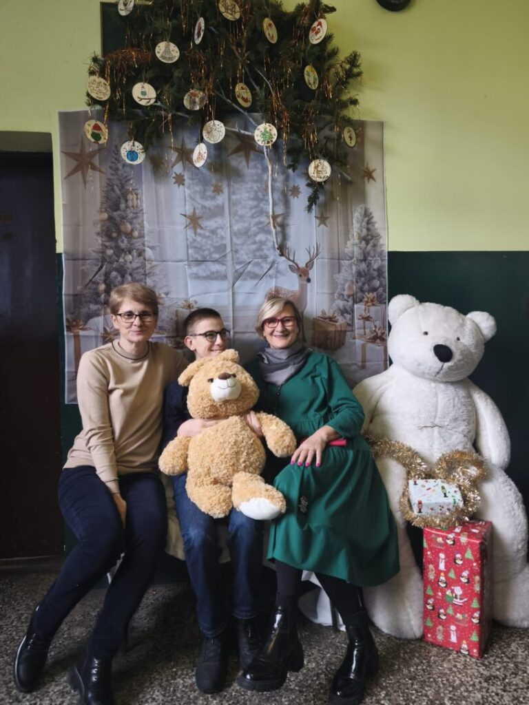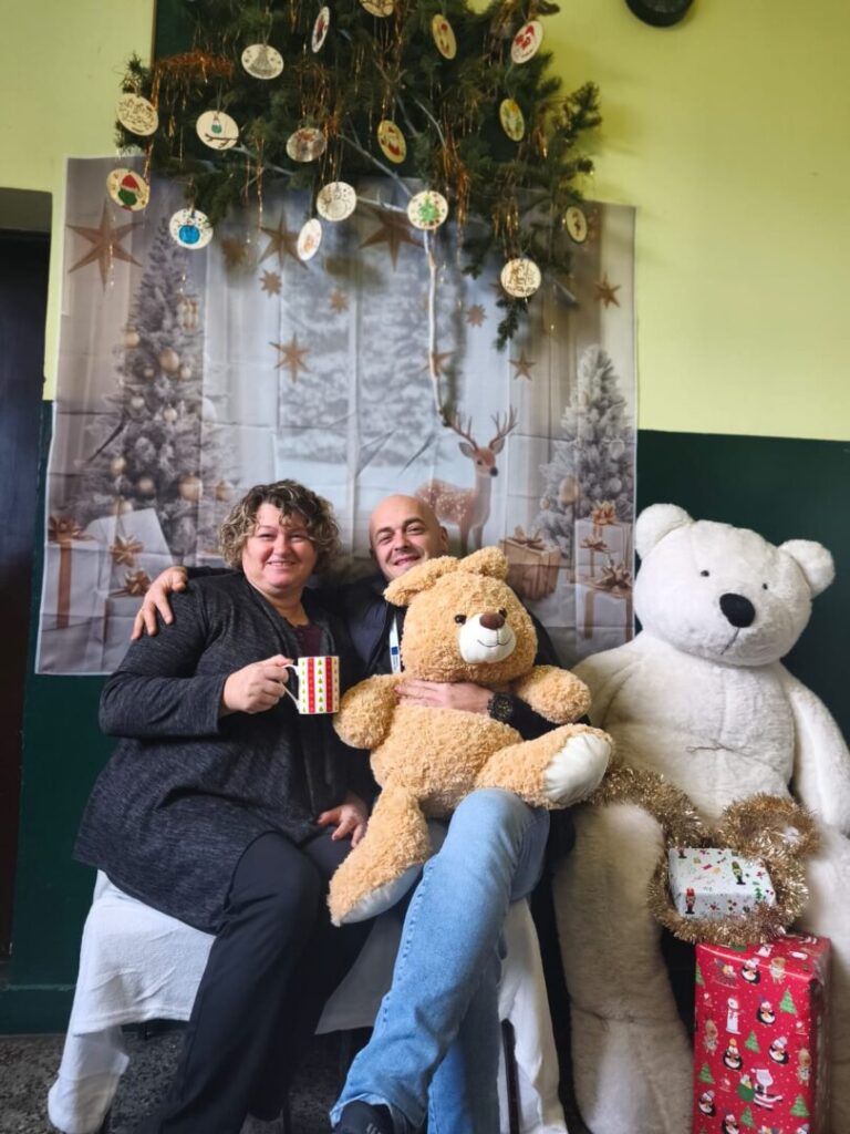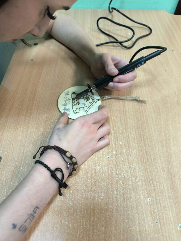 Danas nam je veselje donio mali sretni kutak i dva slatka medvjedića, pa smo odjednom svi postali dio neke druge priče — fotografirali se i smijali. Kutak su uredili članovi Učeničke zadruge „Klasje“, učenici 2.c razreda – frizeri, te 1.e razreda – pomoćni kuhari, kao i svi koji su se ondje zatekli u prolazu. Kuglice na boru su unikatne; izradili su ih učenici 2.c razreda, naši kreativni i maštoviti frizeri, s profesoricom Elvirom Lučić, voditeljicom zadruge. Kuglice su ručni rad na drvenoj podlozi, izrađene tehnikom pirografije i bojicama.
