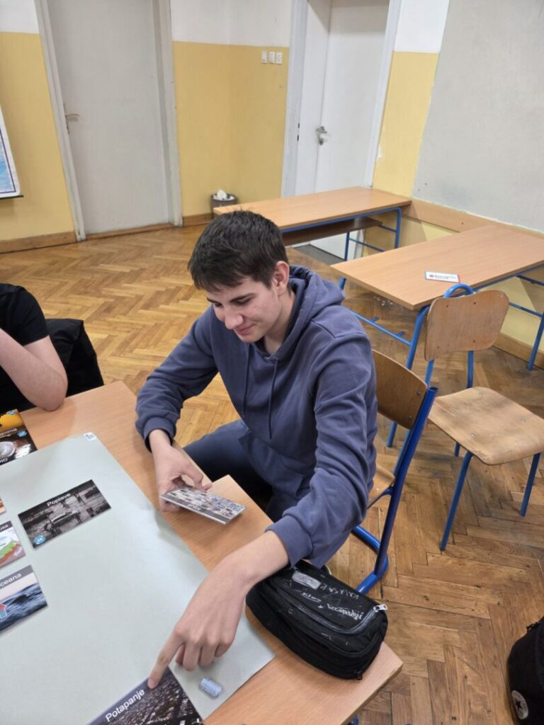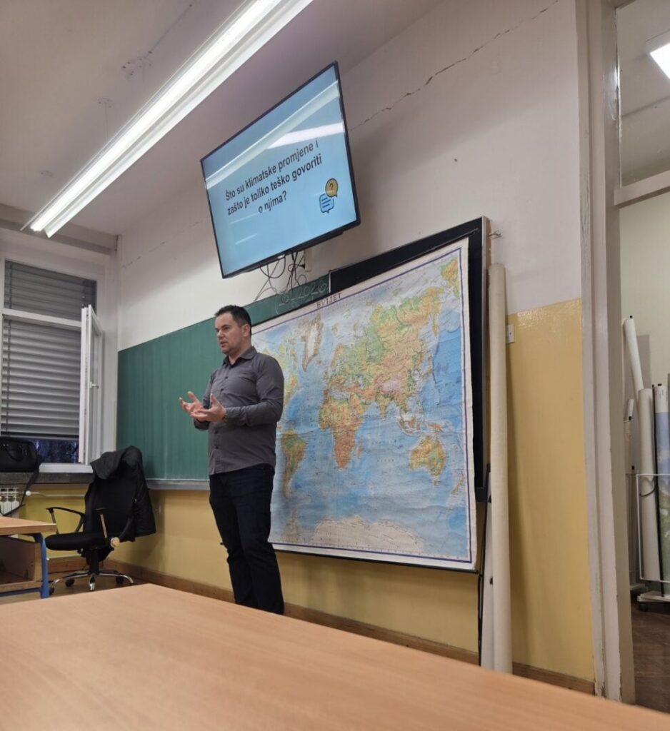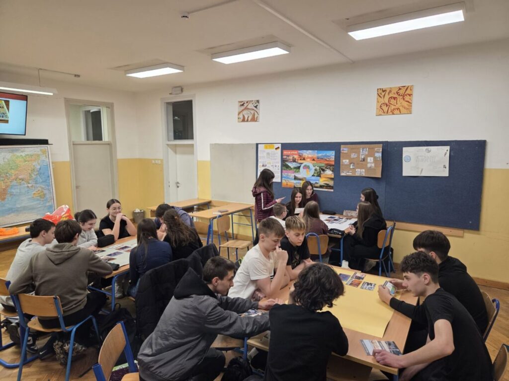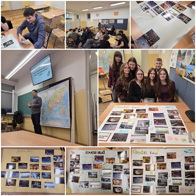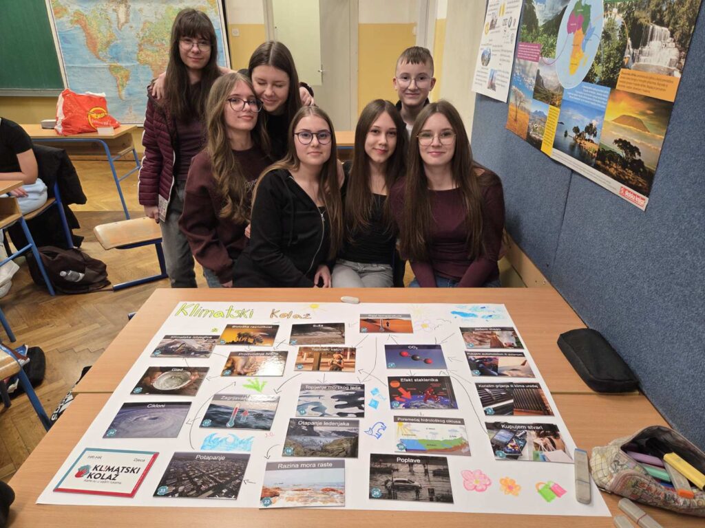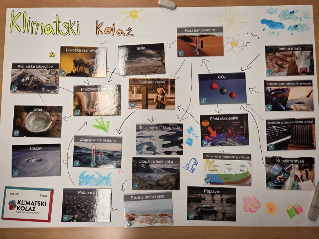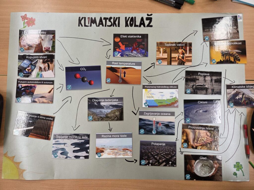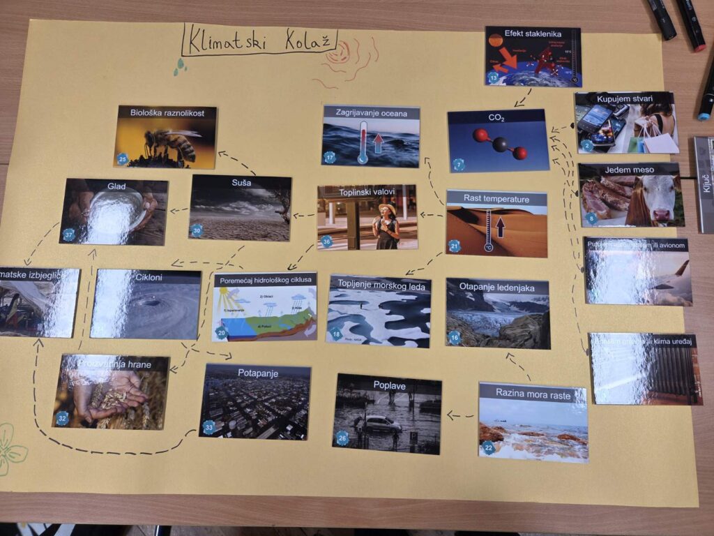 Nakon predavanja učenici naše škole – Elena Ljubičić, Gabrijel Brčić i Marko Miličić iz 2. h razreda, smjer fitofarmaceut – preuzeli su ulogu moderatora edukativne igre „Klimatski kolaž“. Učenici 8. c razreda bili su podijeljeni u tri skupine, a naši su ih učenici pomoću kartica „Klimatski kolaž“ usmjeravali i davali upute pri dešifriranju uzroka i posljedica klimatskih promjena.