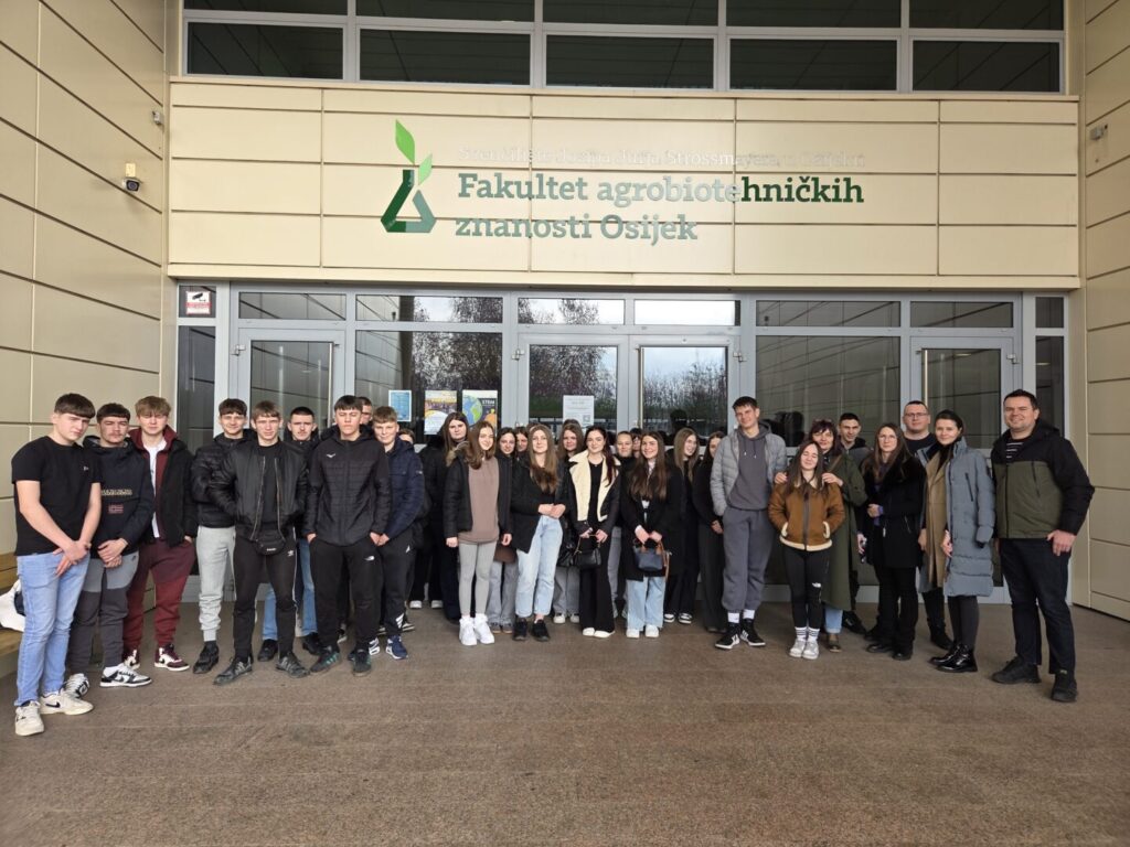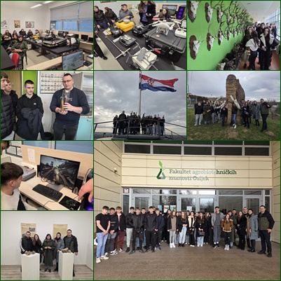 U Osijeku smo posjetili Fakultet agrobiotehničkih znanosti (FAZOS), gdje nas je uvodnim govorom pozdravio dekan prof. dr. sc. Tomislav Vinković i zaželio svima ugodan boravak na fakultetu. Zatim su održane tri radionice i predavanja kako bi učenici bolje razumjeli načine na koje klimatske promjene utječu na poljoprivredu, upotrebu GIS-a i precizne poljoprivrede te važnost primjene prirodnih pesticida. Radionice i predavanja održali su prof. dr. sc. Irena Jug, prof. dr. sc. Mladen Jurišić, prof. dr. sc. Ivan Plaščak, doc. dr. sc. Dorijan Radočaj i doc. dr. sc. Pavo Lucić. Učenici su imali priliku okušati se u simulatoru za upravljanje bespilotnom letjelicom (dronom) te se upoznati s brojnim takvim letjelicama koje fakultet posjeduje.